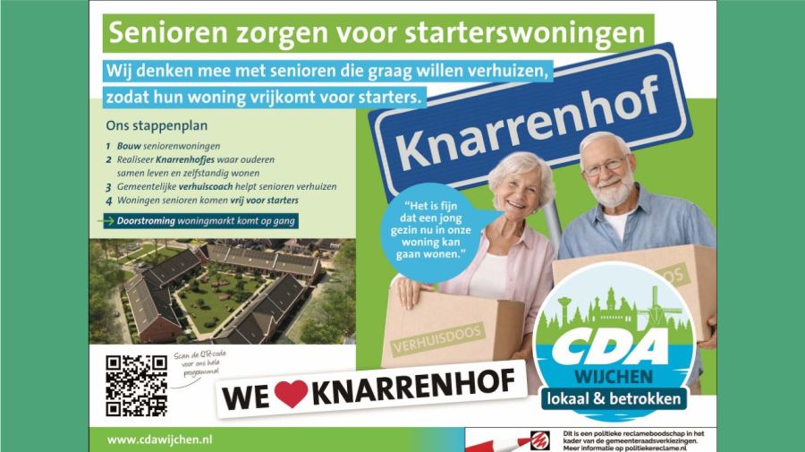 CDA-lijsttrekker Bea Schouten legt het plan uit: “Ons stappenplan begint met het bouwen van seniorenwoningen en de bouw van Knarrenhofjes waar mensen samen leven en zelfstandig wonen. Hierdoor ontstaat het noodzakelijke woningaanbod voor oudere inwoners van onze gemeente om naartoe te kunnen verhuizen. Vervolgens denken wij mee met senioren die graag willen verhuizen, omdat ze kleiner en toekomstbestendiger willen gaan wonen,” aldus Schouten.