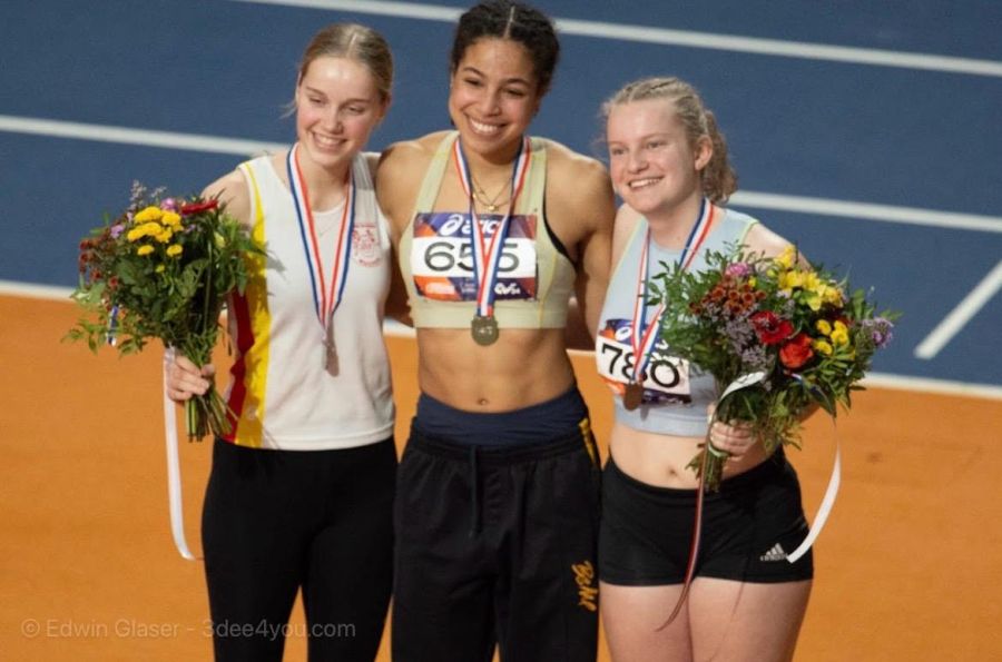Afgelopen weekend vond in Apeldoorn het NK Indoor plaats voor junioren in de categorieën U18 en U20. Op zaterdag was het de beurt aan Lotte Moolenaar (U20, de foto links) op het hink-stap-springen. Na haar bronzen medaille tijdens het NK outdoor in juni, wist Lotte zichzelf, afgelopen zaterdag, in haar derde poging te verbeteren naar 11.80 meter. Met deze knappe afstand bereikte Lotte een tweede plaats, waarmee ze een hele mooie zilveren medaille mee naar Wijchen mocht nemen!