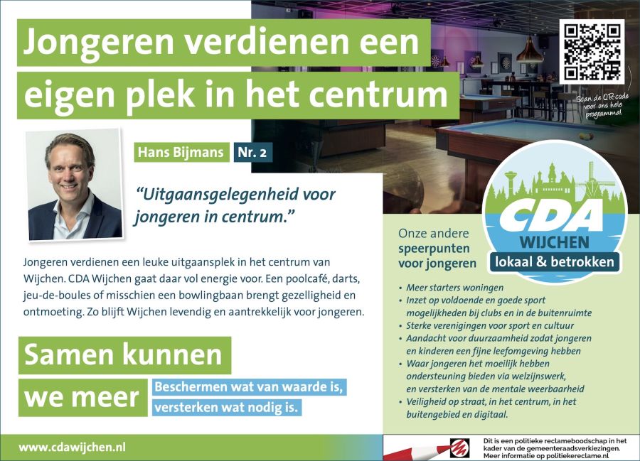Hans Bijmans sluit af: “Wij geloven hierin en gaan hier voor. “Voorzieningen voor Jongeren” is daarmee een belangrijke speerpunt voor het CDA Wijchen bij de gemeenteraadsverkiezingen op 18 maart.“