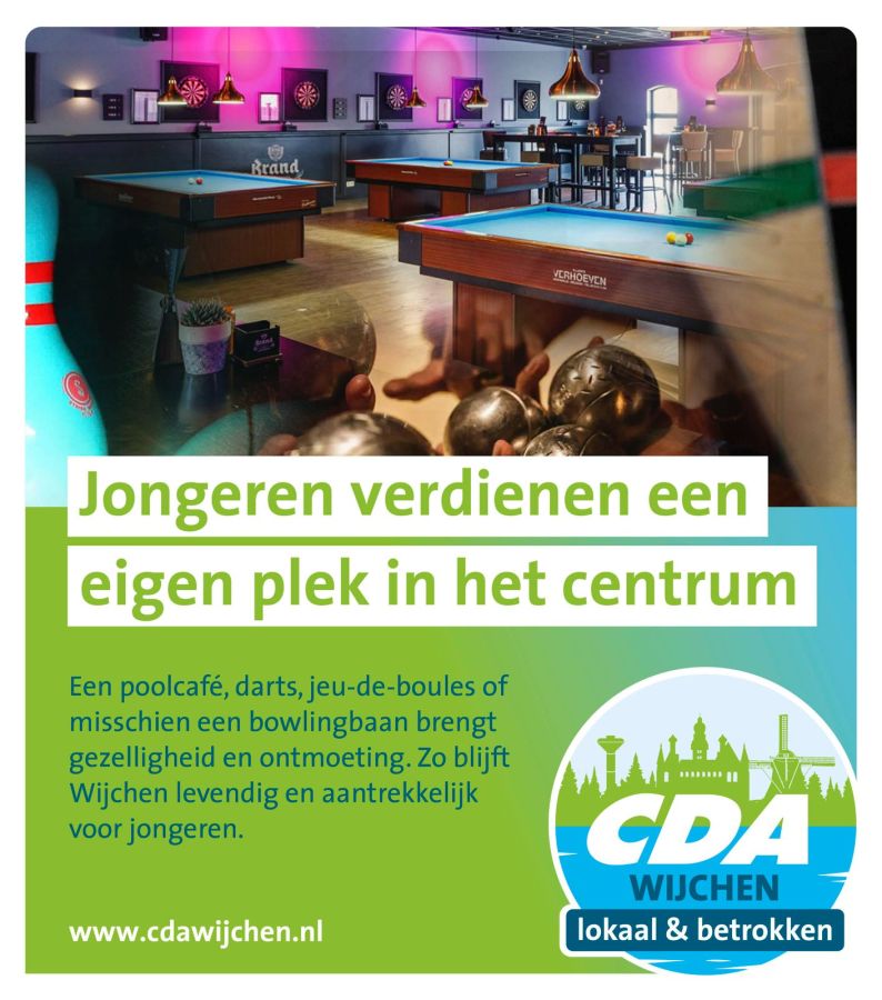 “Een poolcafé, darts, jeu de boules of misschien een bowlingbaan brengt gezelligheid en ontmoeting voor de jeugd met zich mee”, geeft Hans Bijmans, nummer 2 op de kieslijst van het CDA Wijchen, aan. Bijmans vervolgt: “Zo’n mooi, groot dorp als Wijchen moet voor de jeugd tussen grofweg 15 en 21 jaar meer te bieden hebben. Het is zonde als de jeugd ons dorp verlaat of alleen terecht kan bij een vriend of vriendin thuis om elkaar te ontmoeten en het gezellig te hebben. We missen een uitgaansgelegenheid. Ik heb dit gezien bij mijn kinderen toen zij die leeftijd hadden. Daarom willen wij ons inspannen voor een uitgaansplek in het centrum voor jongeren. Zo blijft Wijchen levendig en aantrekkelijk voor de jeugd.”