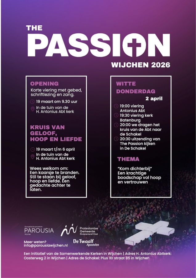 Om 20.00 uur zullen we vertrekken. Voor het dragen van het kruis kunnen mensen zich aanmelden om een stukje van de route te helpen. Dit kan via info@parousiawijchen.nl