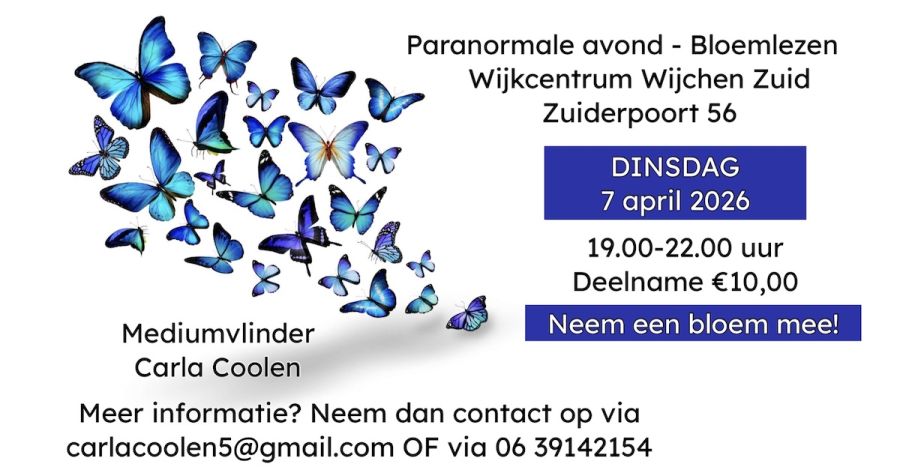 Dinsdag 7 april Paranormale avond - bloemlezen Mediumvlinder - Carla Coolen 19.00-22.00 uur Deelname €10,00