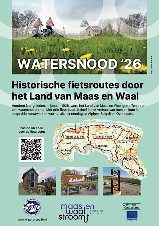 Er is een nieuwe fietsroute uitgezet, vanwege de herdenking van de dijkdoorbraak, 100 jaar geleden: “WATERSNOOD26”. 3 Fietsroutes door het land van Maas en Waal.