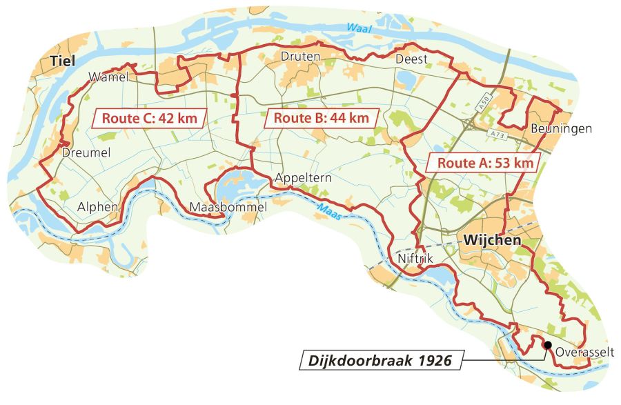 Er zijn drie op elkaar aansluitende lussen van ongeveer 45 kilometer uitgezet, door heel Maas en Waal. Je kunt de route beginnen bij het nieuwe monument De Doorbraak, op de dijk van Overasselt. In ieder dorp vertellen markante punten iets over de gebeurtenissen van toen. Je fietst langs stoomgemalen, noodwoningen, gedenktekens, hooggelegen vluchthavens, oude Maasbochten, maar ook langs moderne stuwen, sluizen en gemalen. Helemaal in het westen kom je bij de plek waar twee gaten in de dijk werden gemaakt om het water weg te laten lopen, in Alphen aan de Maas.