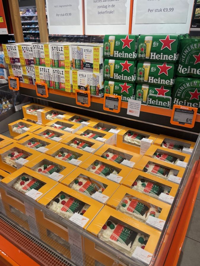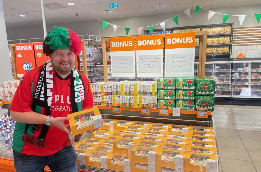 Thijs Verhagen is al dagen in de stemming voor de aanstaande bekerwedstrijd die NEC zondag speelt tegen AZ. Thijs, die zich al jarenlang dag in, dag uit inzet voor de club, heeft op vrijdag 17 april het eerste startschot gegeven met de verkoop van de speciaal ontworpen NEC-slagroomschnitte bij de gezellige supermarkt op de Homberg.