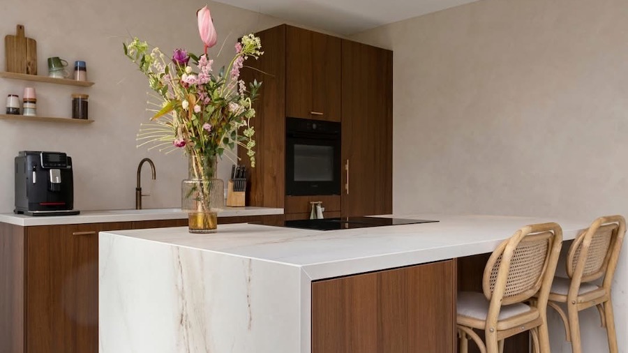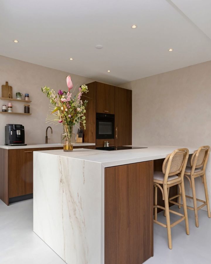 “Deze keuken mixt stijlen op een mooie manier. Het ontwerp is strak en minimalistisch, maar door de houtlook, lichte tinten en barkrukken krijgt u ook een Japandi-gevoel. U hoeft niet één stijl te kiezen: combineer wat u mooi vindt”, laten de keukenspecialisten van Janssen keukens aan de Nieuweweg weten.