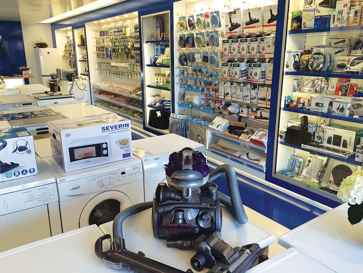 In het magazijn liggen wel 50 verschillende gereviseerde wasmachine- en wasdroger motoren maar ook alle merken stofzuigerzakken en een enorme keuze uit de meest uiteenlopende onderdelen. In de werkplaats worden verschillende reparaties aan machines uitgevoerd.