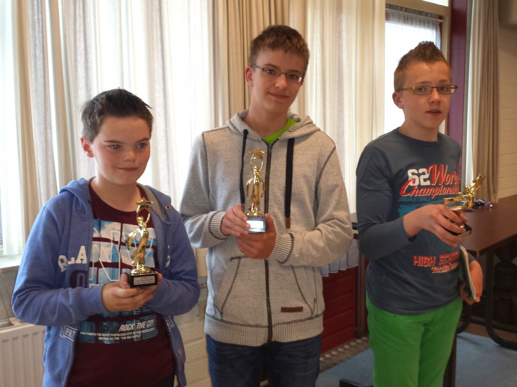 De eerste drie prijswinnaars van het IJSCO-jeugdschaaktoernooi Wijchen 2015 Arthur Maters, Kevin Verfürth en Tobias de Vries.