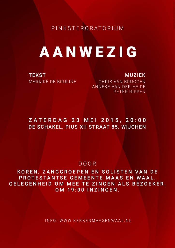 Op de zaterdag voor Pinksteren voeren koren, zanggroepen en solisten van de protestantse gemeenten in heel Maas en Waal gezamenlijk het Pinksteroratorium ‘Aanwezig’ uit.