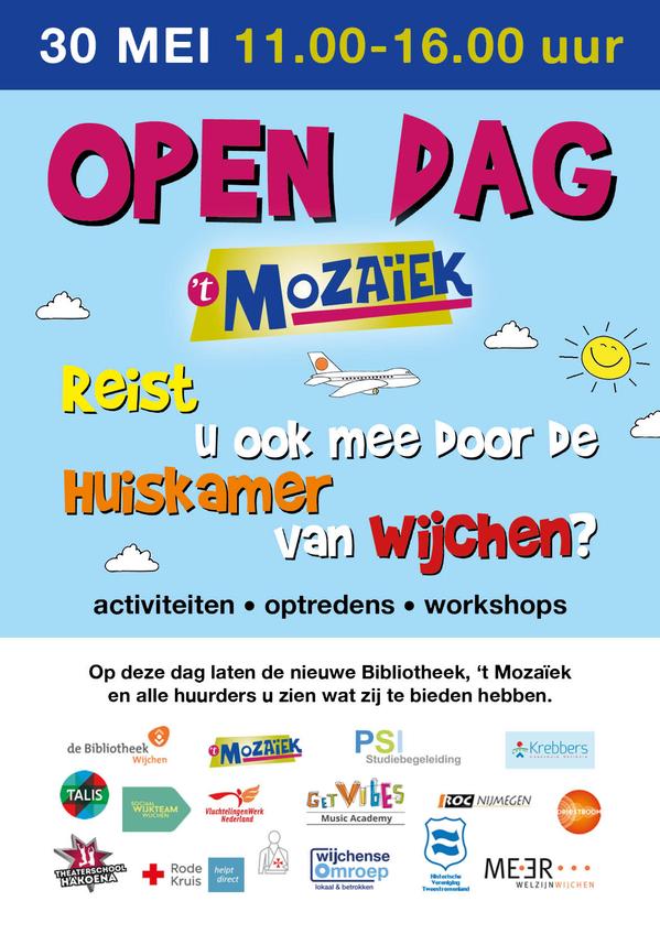 Zaterdag 30 mei van 11.00 tot 16.00 uur is iedereen van jong tot oud van harte welkom bij ’t Mozaïek in Wijchen. Dan is de feestelijke open dag van de nieuw- en verbouw van het Sociaal Cultureel en Educatief Centrum met als eye-catcher de prachtige Bibliotheek. De vele huurders hebben samen met ’t Mozaïek een bijzondere beleving opgezet waarbij de bezoekers niet alleen zien en ervaren hoe mooi het is geworden, maar ook kunnen horen, proeven en luisteren wat het veelzijdige gebouw te bieden heeft.