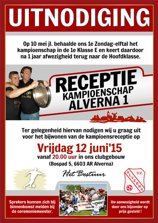 Op 10 mei behaalde het 1e Zondag-elftal van voetbalvereniging Alverna het kampioenschap in de 1e-Klasse-E - het keert daardoor na 1 jaar afwezigheid terug naar de Hoofdklasse. Ter gelegenheid hiervan nodigt de club u graag uit voor het bijwonen van de kampioensreceptie in het clubgebouw aan Bospad 5 op vrijdag 12 juni.