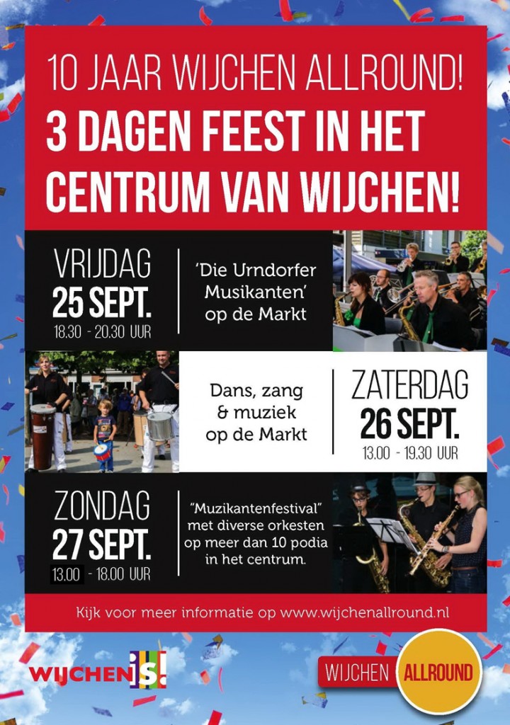 De Stichting Wijchen Allround vertelt enthousiast: "Het kenmerk van de festivals is het maken van gezellige muziek, zang, dans en theater op een heel toegankelijke manier. Zowel voor de deelnemers als voor de toeschouwers. Met het jubileumweekend in het laatste weekend van september (