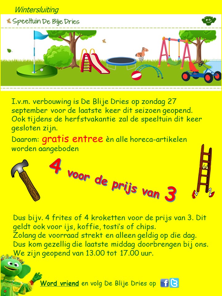 Op zondagmiddag 27 september is de laatste middag dat de Blije Dries geopend is dit seizoen. Ook in de herfstvakantie zijn we gesloten. Er komt een stevige verbouwing aan en om tijdig te kunnen openen op 2e Paasdag is er besloten tot deze maatregel.