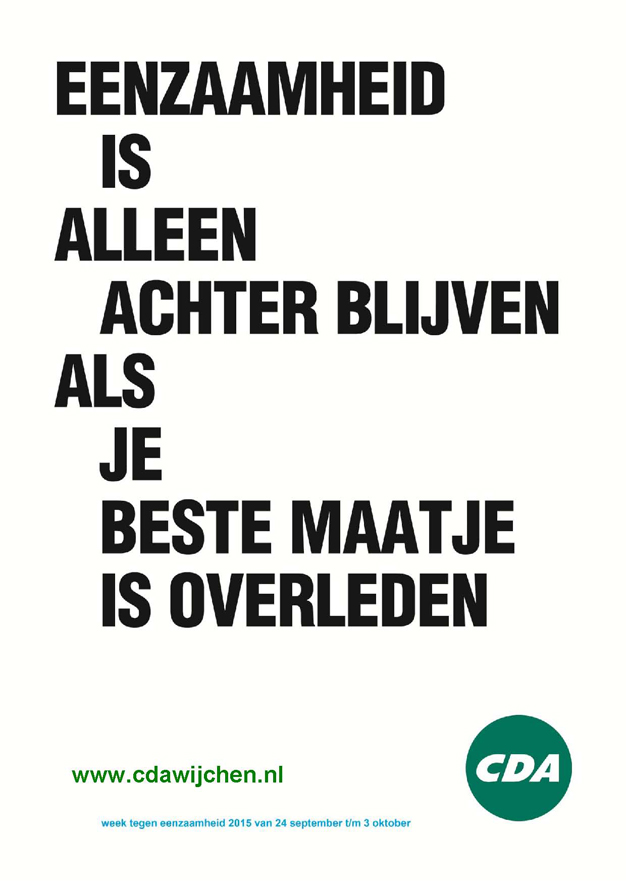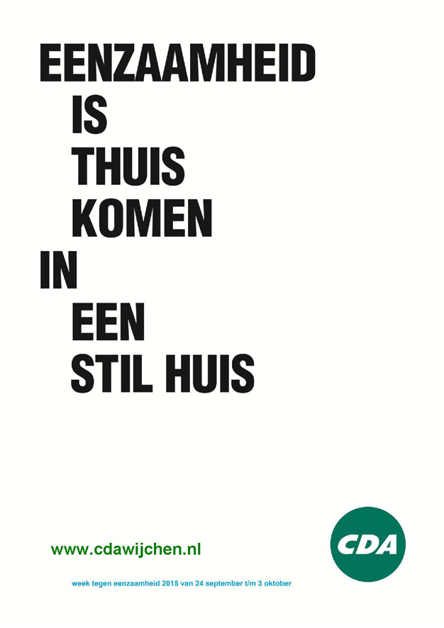 In de week tegen eenzaamheid wil het CDA Wijchen extra aandacht vragen voor eenzaamheid. Deze aandacht vragen zij door middel van een campagne met posters. Deze posters, met korte slogans, wijzen Wijchenaren op de toenemende mate van eenzaamheid onder de inwoners. Om eenzaamheid te voorkomen is volgens het CDA Wijchen een meer integrale aanpak nodig. Daarnaast heeft het CDA Wijchen vragen aan het college gesteld om te achterhalen wat nodig is om toenemende eenzaamheid tegen te gaan.