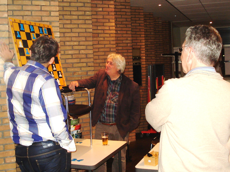 Foto: Schaaklegende Jan Timman demonstreert zijn winstpartij. Kasteelschaker Willem van Berkel is aandachtig toeschouwer. Fotograaf: Ritchy Duin