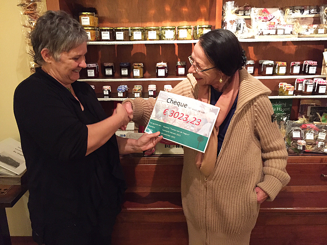 Op maandag 16 november werd aan Bernadette Baaijens van woonzorgboerderij de Hagert een cheque van ruim € 3000,- overhandigd door Victoria van Aalst van de Tuinmarkt Kasteel Hernen.