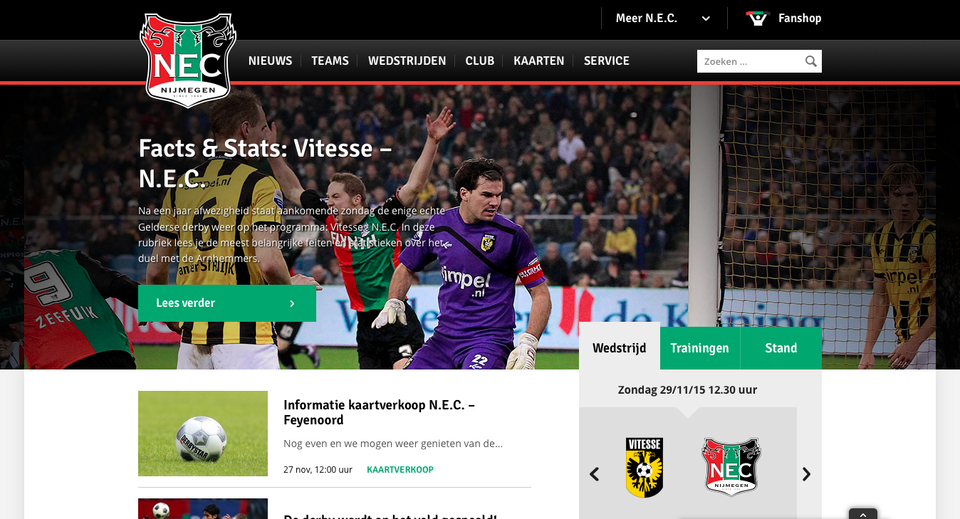 Binnen de geheel vernieuwde website ligt de focus natuurlijk op de eerste selectie van N.E.C. Op de uitgebreide spelerspagina’s worden de laatste statistieken automatisch bijgewerkt, zijn bureaubladachtergronden te downloaden en zijn samenvattingen en exclusieve video’s van N.E.C. TV te bekijken in een volledig rood-groen-zwarte omgeving. Rondom wedstrijden staat de wedstrijdbeleving centraal met snelle links naar voorbeschouwingen, reacties naderhand en uniek fotomateriaal.