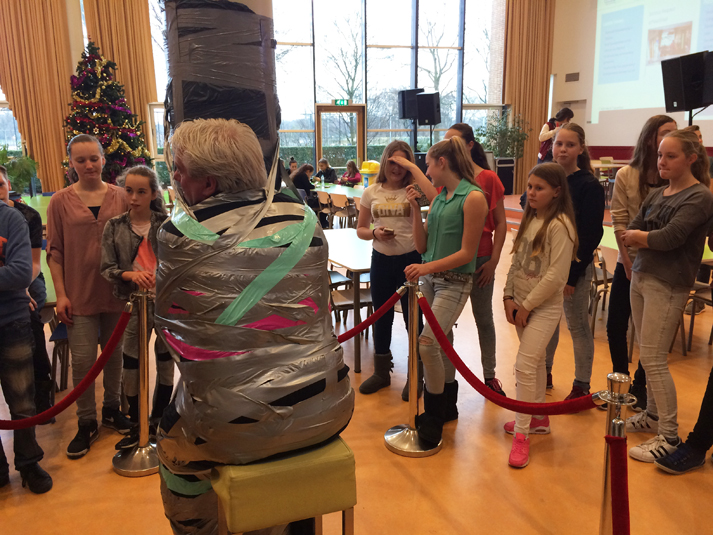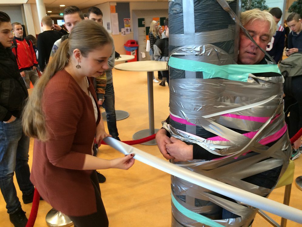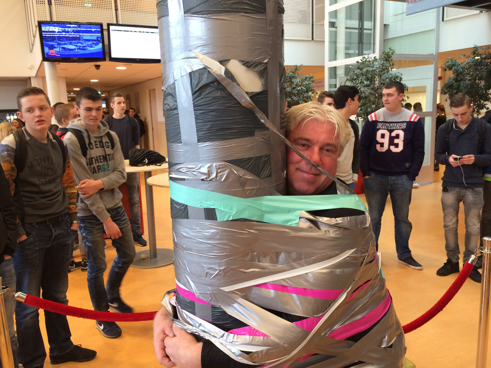 Speciaal voor Gé Klaassen, de conciërge van het Maaswaal College, was op woensdag 16 december de actie 'P(l)ak je kans en plak de conciërge aan de paal' bedacht. Het ziet er een beetje raar uit; Gé vertelt: "Ik voel me behoorlijk opgesloten en warm en moet dit in totaal anderhalf uur volhouden! Maar het is voor het goede doel. En dan doe ik het graag!" Dit ludieke idee kwam uit de koker van de leraren van het Maaswaalcollege en levert de Serious Request-actie zeker boven de 100 euro op!