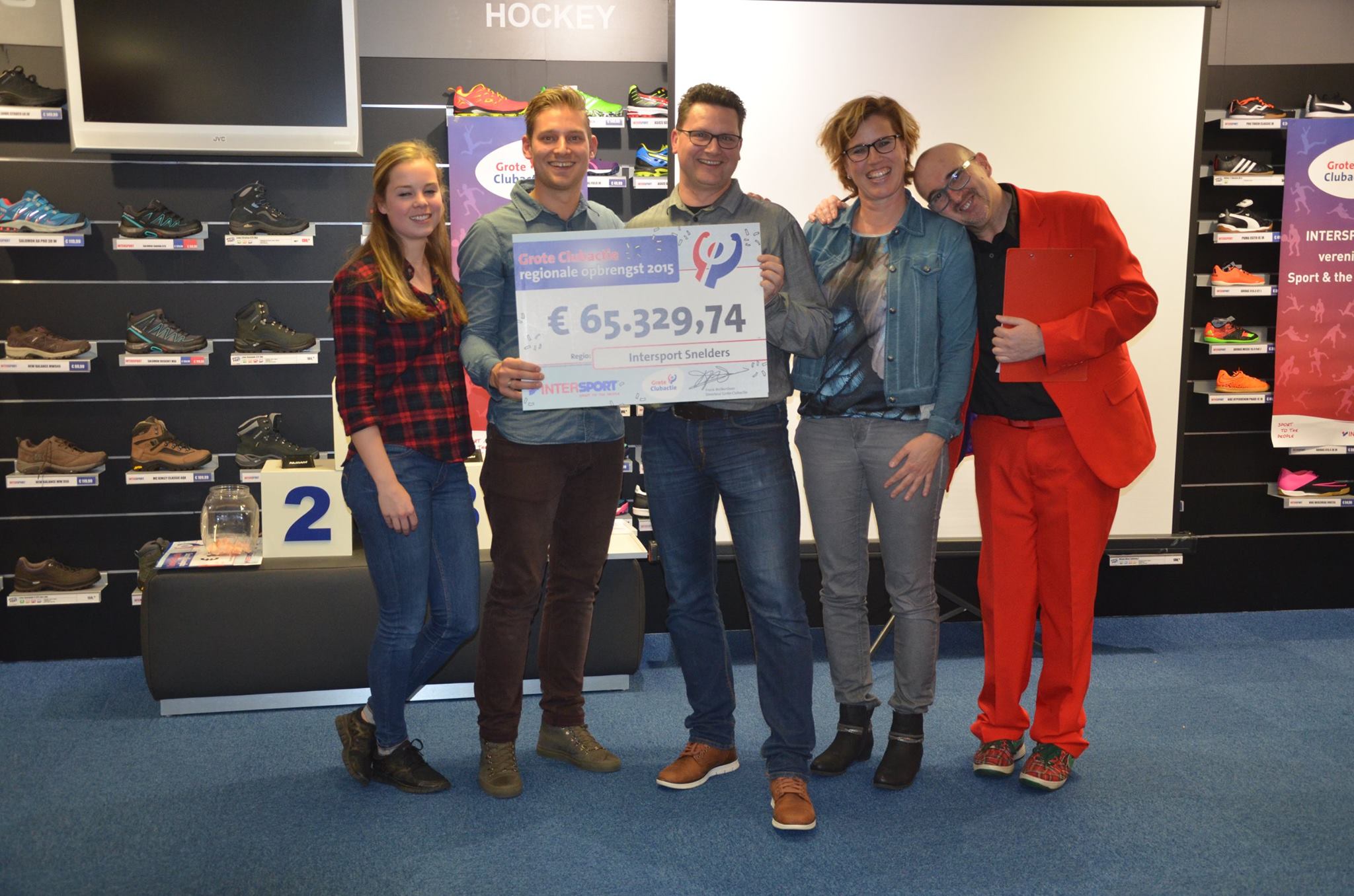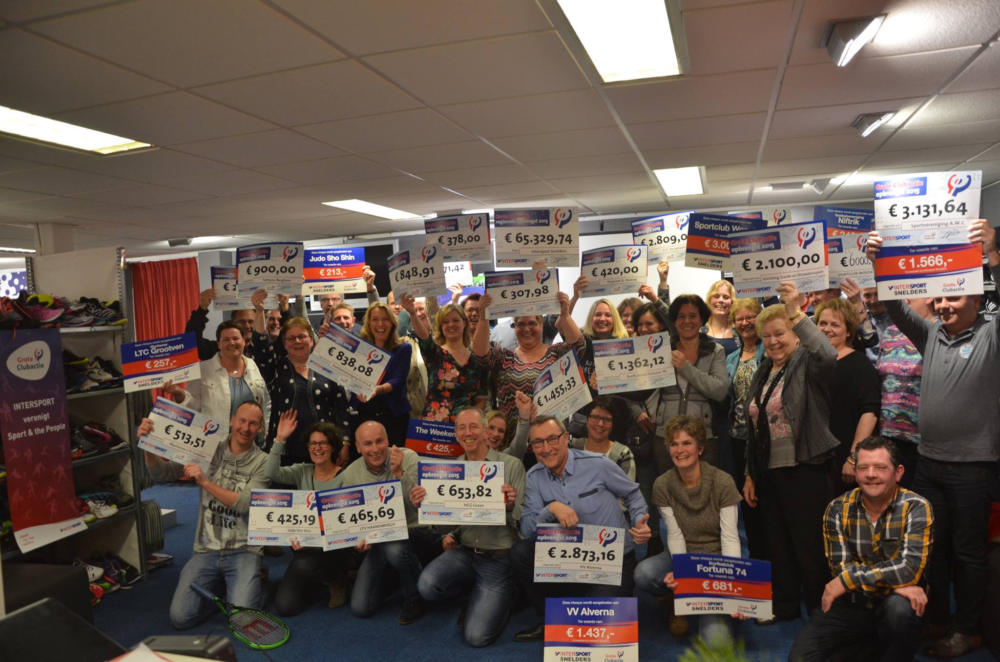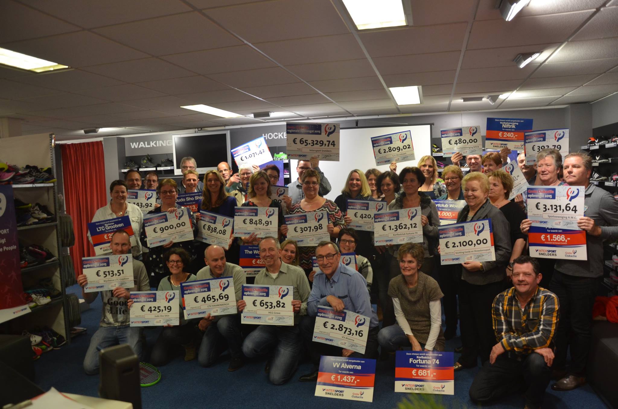 De waarde die zij zelf hadden behaald met hun verkoop (zie de cheques op de foto's) werden echter door Intersport Snelders bij besteding in de winkel nu met 50% verhoogd. Hierdoor krijgen de verenigingen nu dus een hele hoge korting! In totaal hebben 57 verenigingen in de regio hieraan meegedaan en er waren op 15 december 23 aanwezig