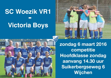 Zondag 6 maart 2016, aanvang 14.30 uur: SC Woezik VR1 - Victoria Boys VR. SC Woezik won uit met 3-1, maar was geen makkie, dus . . . ga ze aanmoedigen! Mocht het regenen: geen nood, de meiden spelen altijd op het hoofdveld.