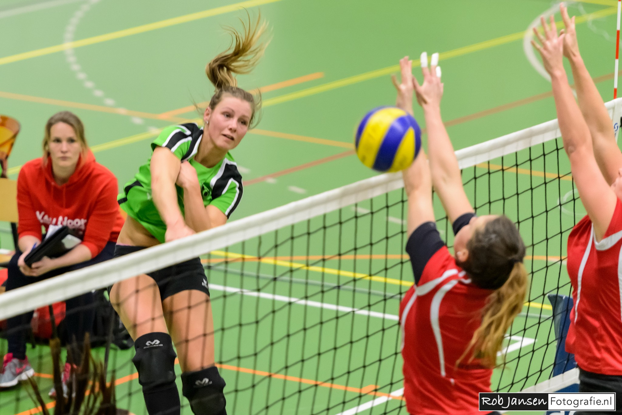 Elkie Jaspers slaat de bal hard langs het blok van VC velden