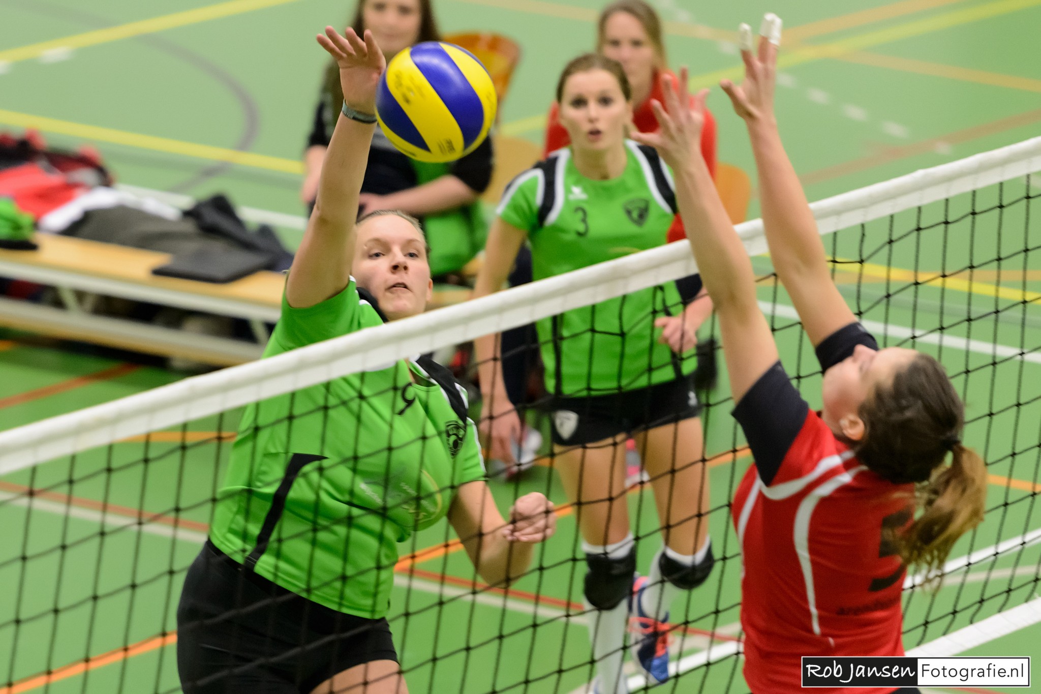 Manon Ottjes en Nienke Visser blokkeren een aanval van VC Velden