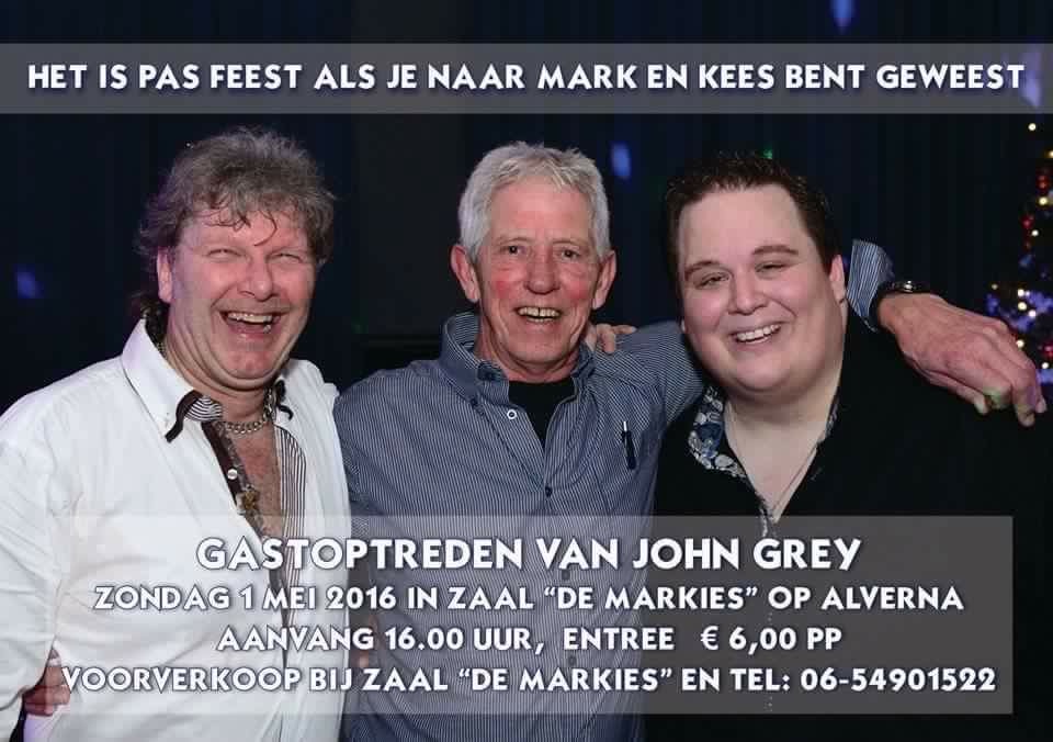 Deze meezingmiddag op 1 mei is met medewerking van Kees Plat en Mark van Veen - en er is een gastoptreden van John Gray. Op deze middag wordt ook de videoclip opgenomen van Mark van Veen voor zijn nieuwe single. Kortom: het wordt een gezellige middag met veel liedjes, van The Cats en Hazes en nog veel meer gezellige meezingnummers. Kaarten zijn verkrijgbaar voor € 6 p.p. bij zaal De Markies, Graafseweg 600 in Alverna/Wijchen en via 06-54901522.