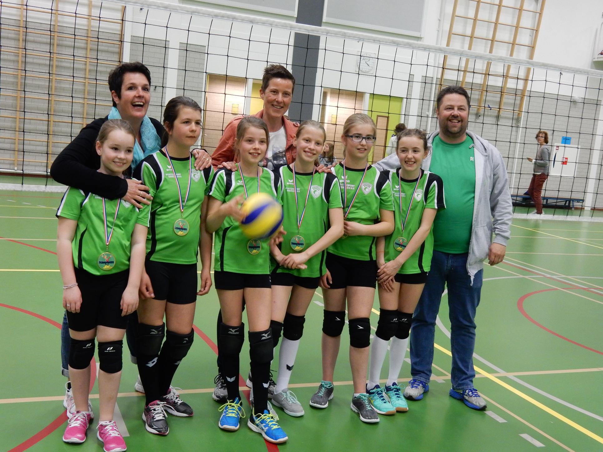 Dit zijn de trotse kampioenen! Van links naar rechts: Noa van den Broek, Indy Voss, Mirre Graat, Evie Driessen, Floor Poos en Ilse Langeslag. Op de achtergrond de coaches (Dyonne Voss en Solange Graat) en de trainer van zaterdag (Tom Pelser).