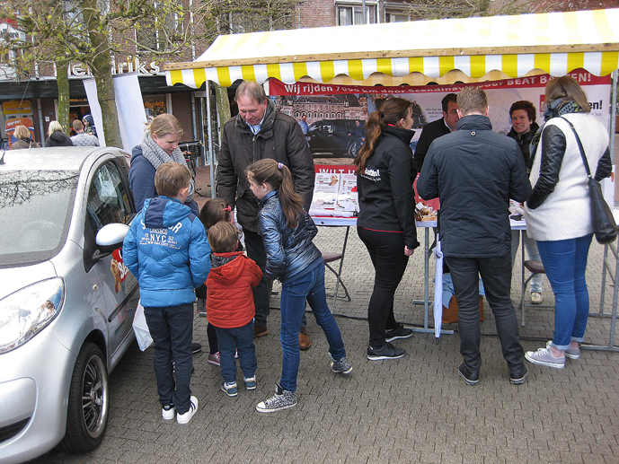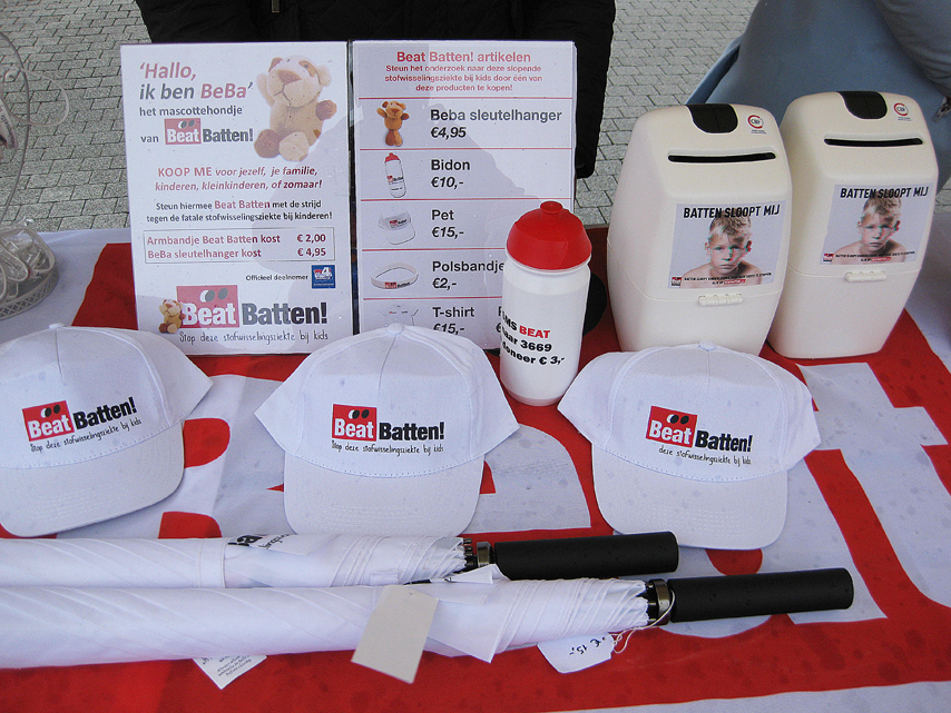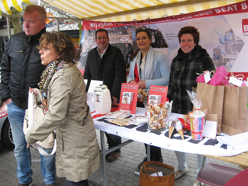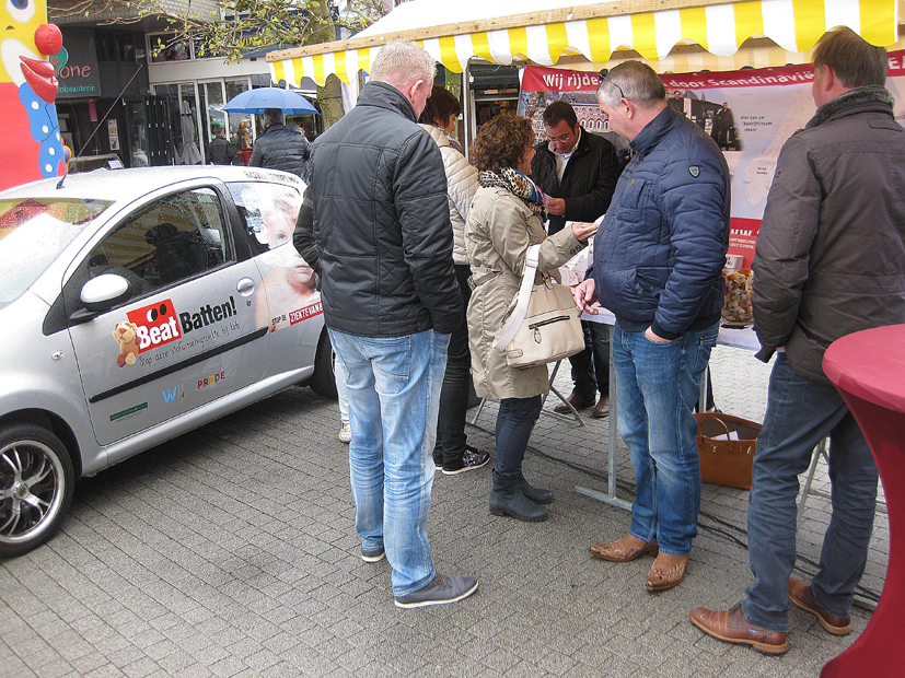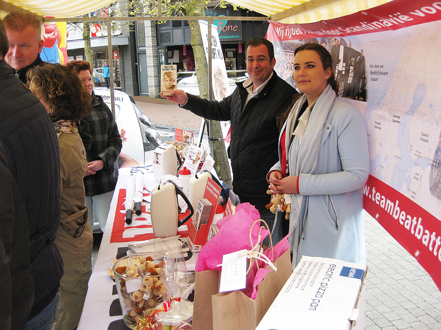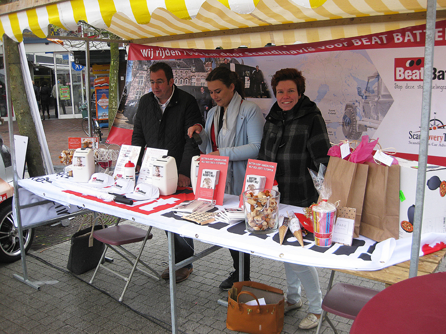De Duurzaamheidsmarkt in het centrum van Wijchen op zondag 23 april had te kampen met slecht weer. Gerwin Koopsen uit Wijchen wilde op deze Duurzaamheidsmarkt aandacht en steun genereren voor 'Beat Batten', dus voor de bestrijding van deze kinderstofwisselingsziekte. Meer informatie over 'Beat Batten': www.gkautos.nl, Kamerlingh Onnesstraat 11-B, Wijchen Telefoon: 024-388 3444.