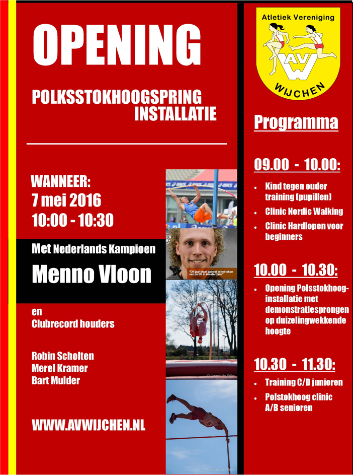 Op 7 mei neemt AV Wijchen de spiksplinternieuwe polsstokhoogspringinstallatie in gebruik. Om deze installatie aan te kunnen schaffen hebben ze als vereniging hard gewerkt en gespaard. Met heel veel inspanning van eigen leden, bijdragen van onze sponsoren en geld uit eigen middelen ligt er nu een prachtige mat. De feestelijke ingebruikname zal starten met een demonstratiewedstrijd. Niemand minder dan regerend Nederlands kampioen polsstokhoogspringen komt naar Wijchen voor de opening van deze gloednieuwe polsstokhoogspringmat. Met Menno Vloon komt er dus niet zomaar iemand springen! Hij heeft de limiet van 5.55 m voor de Europe kampioenschappen namelijk al op zak. Hij zal om 10.00 uur springen tegen de Wijchense talenten Robin Scholten, Merel Kramer en Bart Mulder.