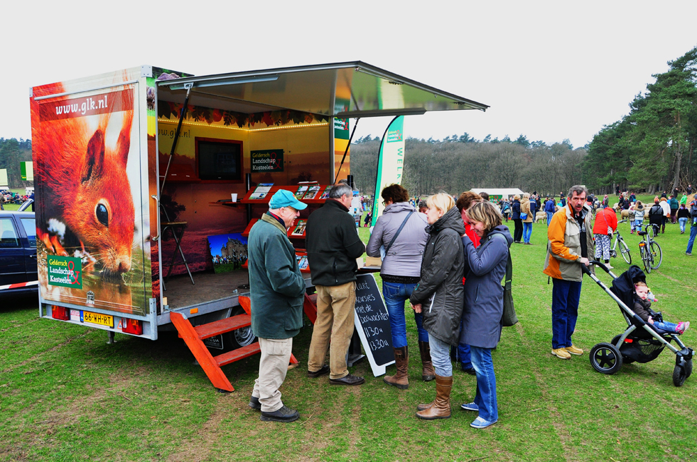 Vanuit de promotiewagen of -kraam bezoekers informeren over het werk van Geldersch Landschap & Kasteelen en actief donateurs werven.