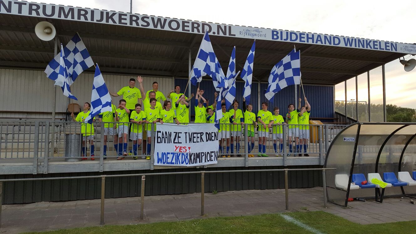 daar was de kampioenswedstrijd van Woezik D8. Heel bijzonder, want het team was in augustus 2015 gestart in de 5e klasse 22. Ongeslagen, na 11 wedstrijden, één wedstrijd gelijk, 31 punten, 81 doelpunten voor en 9 doelpunten tegen, werd de herfstcompetitie afgerond op de eerste plaats. Dat betekende promotie naar de 4e klasse. Een oefenwedstrijd tegen een 4e klasser werd gewonnen. Doelstelling voor Woezik D8 in de 4e klasse 09 gezet op de bovenste helft, een grote ambitie. Ook in de 4e klasse ging het goed, ergens werd averij opgelopen tegen de laatste plaats met een gelijk spel. Maar de rest werd gewonnen. De laatste wedstrijd van het jaar kon Woezik D8 ook als kampioen het voorjaar afsluiten.