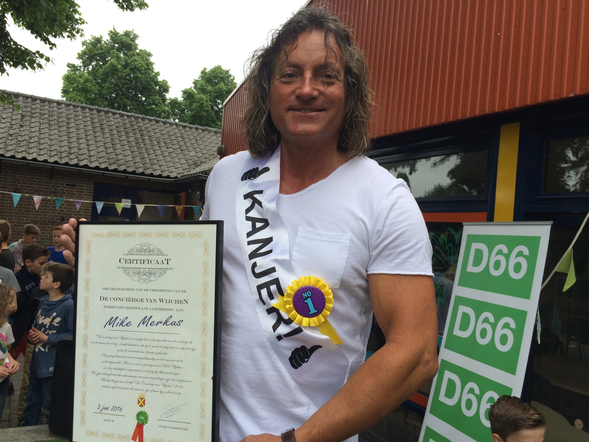 Mike Merkus van Basisschool ’t Heilig Hart (Hernen) is op vrijdag 3 juni uitgeroepen tot de beste conciërge van Wijchen. D66 Wijchen had deze actie opgezet, met als doel om de beste conciërge van Wijchen kenbaar te maken.