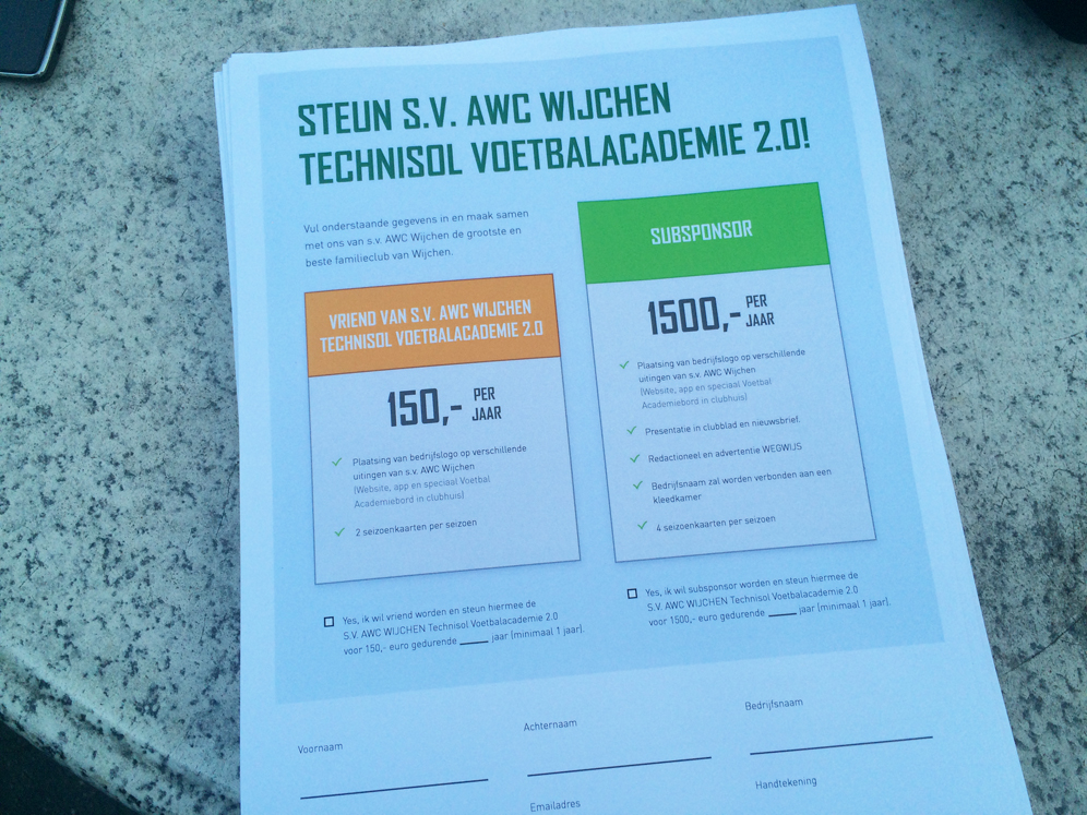 Meegedeeld werd dat de samenwerking tussen voetbalclub en businessclub van AWC hechter zal gaan worden volgens de voorzitters Harm Rutten en Erick Loermans: "AWC leeft!", aldus beiden. "Met meer dan 1000 leden willen we AWC een nieuwe uitdaging gaan geven." Zo gaan Guus van Schijndel, bestuurslid technische zaken, en Piet Hubers, de architect van "het sv AWC voetbalplan 3.0" de Wijchense 1e klasser op een hoger niveau brengen.