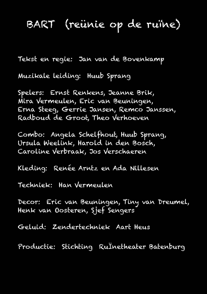 Een toch vooral vrolijke voorstelling voor het hele gezin maar net zo goed voor alleenstaanden. Veel muziek en zang want ook het schoolorkest “Het Cortensia College Combo” is aanwezig. Het theatergezelschap ziet u graag komen op één van de hopelijk zonnige zomerse middagen dan wel avonden. Misschien werkt het voor u ook een beetje als een reünie. Overigens zal Bart niet aanwezig zijn…