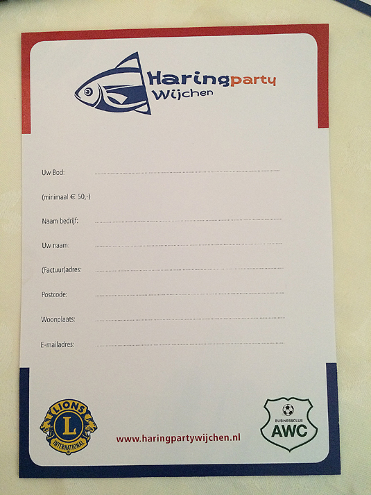 De jaarlijkse Haringparty werd dit jaar op woensdag 15 juni gehouden in Villa Sterrebosch. De organisatie in handen van Frans Jansen, Jan Reith en Helmien Jansen van de Lionsclub Wijchen, Peter Giesbers van Businessclub AWC en Geert Sanders van Sterrebosch keek tevreden terug op een geslaagd evenement. Via een Amerikaanse veiling, een opbodveiling en een afslagveiling werd geboden op de overheerlijk gloednieuwe haring die traditiegetrouw bereid werd door Vishandel Kersten! Dit jaar was het goede doel voor de avonturengroep de Blauwe Vogels van mensen met een beperking. Ze kunnen nu met zijn allen naar een activiteitenkamp in Batenburg.