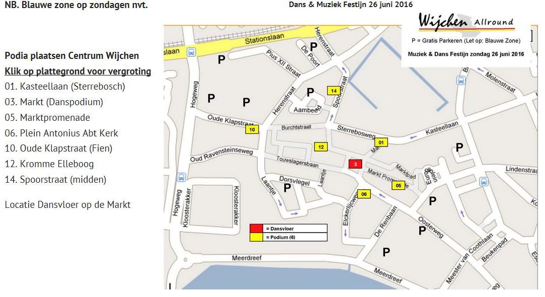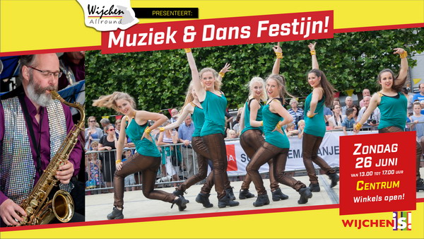 Zondagmiddag 26 juni a.s. organiseert de Stichting Wijchen Allround het Muziek & Dans Festijn in het centrum van Wijchen. Het programma begint om 13:00 uur en eindigt om ca. 17:00 uur.