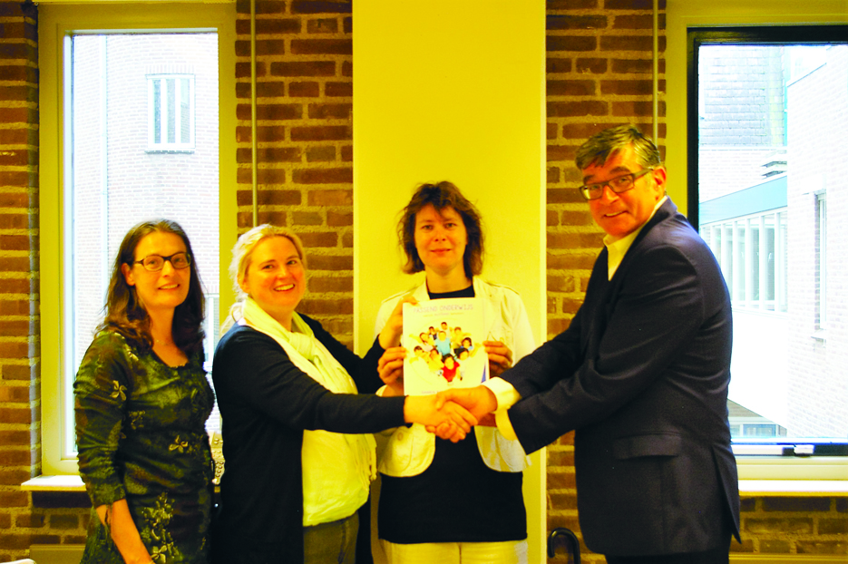 De zorgcoördinatoren dhr. M. Verbruggen en mw. S. Jacobs en afdelingsleider drie havo/vwo mw. A. v.d. Maas van het Maaswaal college nemen het rapport van de werkgroep in ontvangst.