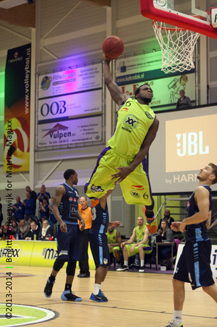 LEEUWARDEN, 15 maart 2014 - Matrixx Magixx leek in het derde kwart een beslissende voorsprong te nemen (54-67) maar zag Aris Leeuwarden in slotkwart even de leiding nemen (76-73). Vanaf de vrije worplijn won Matrixx Magixx het duel uiteindelijk met 90-97.