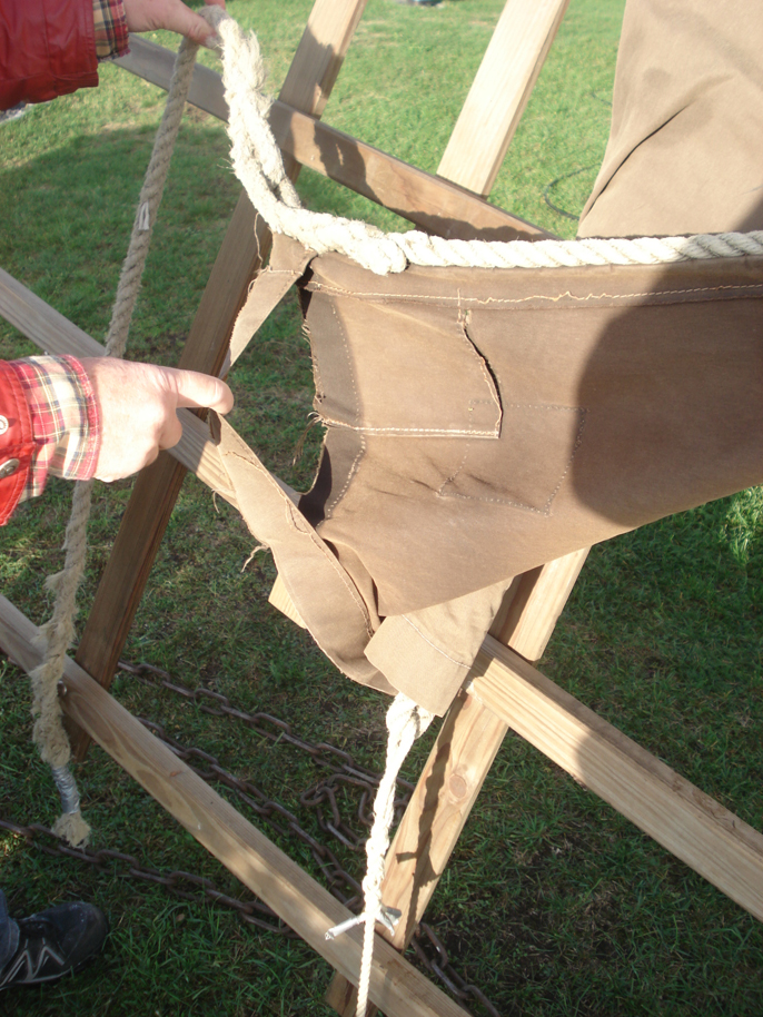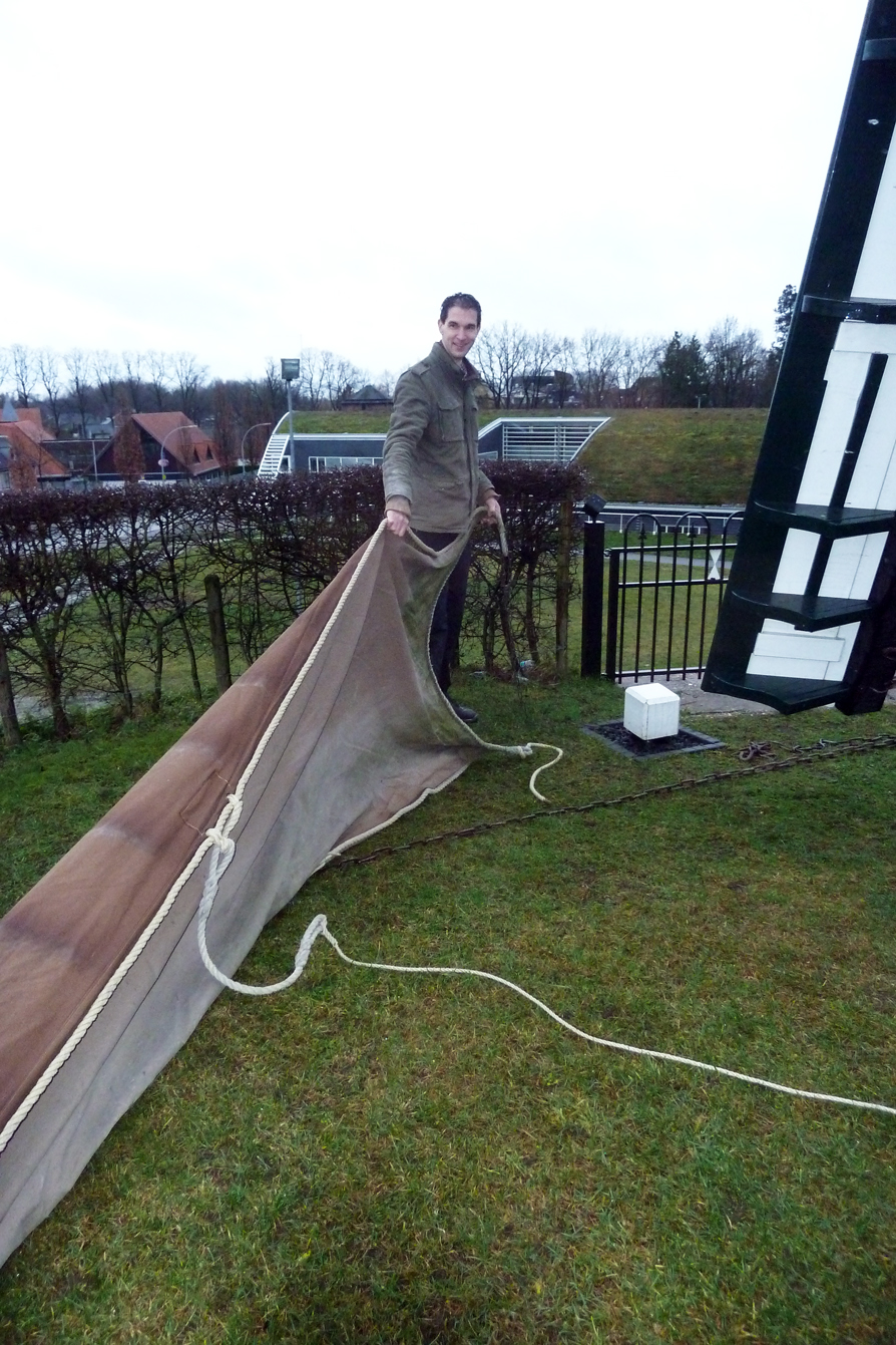 Ook het monteren van deze zeilen is een unieke belevenis. Denk alleen al maar aan de grote van de zeilen (12,5 x 1,5 meter) en de hoogte van de wieken (12 meter). Daarnaast moet het zeil vlak op de wieken komen te liggen, en de vele touwen moeten passend gemaakt worden voor elke wiek afzonderlijk.