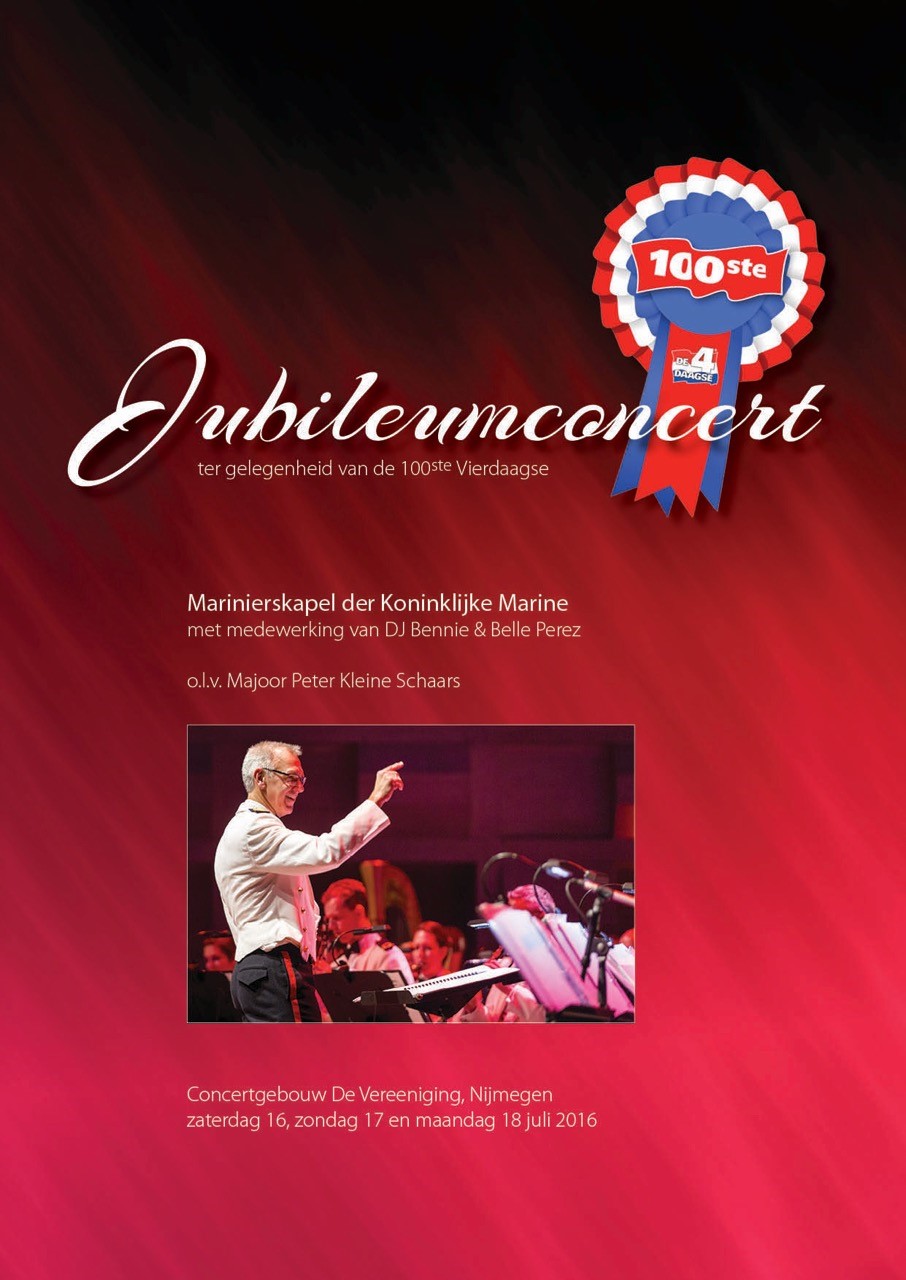 Voor een drietal jubileumconcerten van de Marinierskapel der Koninklijke Marine ter gelegenheid van de 100ste Vierdaagse zijn kaarten beschikbaar. Liefhebbers kunnen tijdens de openingstijden van de Stadsschouwburg bij de kassa voor €1,00 een kaartje bemachtigen.