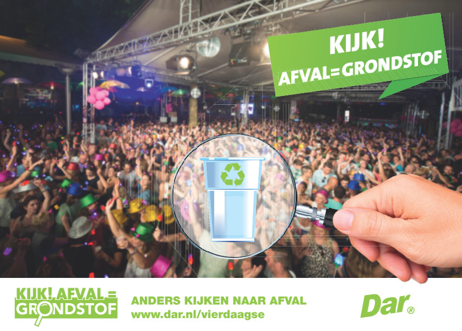 Oranje (voor plastic+: plastic, blik en pak) en roze containers (voor restafval) zijn zichtbaar tijdens de Vierdaagse feesten- en marsen. Minder zichtbaar zijn de vele Dar-medewerkers die elke dag vanaf 06.00 uur aan de slag gaan om het afval van de feesten op te ruimen, zodat de binnenstad om 10.00 uur schoon is voor een nieuwe dag. Een grote klus die Dar-medewerkers ieder jaar weer samen met bezoekers en wandelaars met plezier klaren. Ze zorgen niet alleen dat de stad er elke dag weer fris uitziet voor lopers en bezoekers. Ze zorgen ook dat al het afval dat deze week geproduceerd wordt, op een goede manier wordt verwerkt.
