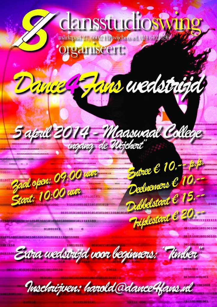 Op zaterdag 5 april organiseert Dansstudio Swing de Dance4Fans-wedstrijd in het Maaswaal College (ingang “De Wijchent”. Dance4Fans is een bijzondere vorm van Streetdance: Clipdance. Hierbij wordt de muziek van de nieuwste videoclips gebruikt.