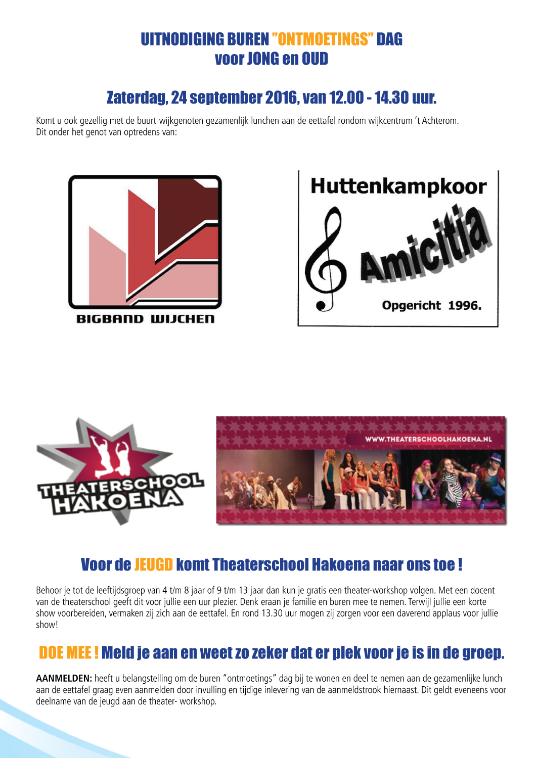 AANMELDEN: Om deze Buren "Ontmoetings" Dag bij te wonen en deel te nemen aan de gezamenlijke lunch aan de eettafel graag even aanmelden door invulling van het aanmeldings- formulier, verkrijgbaar in het