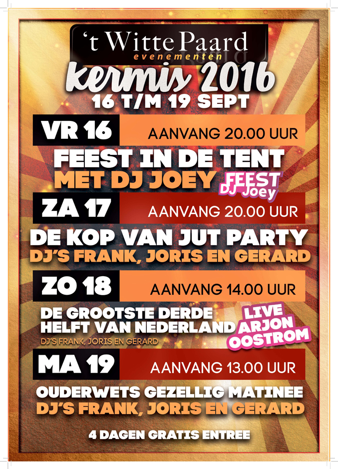 Dat laten Gijs Gommers en Ruud Sommerdijk van 't Witte Paard Evenementen dit jaar weten. De tent bij het gemeentekantoor is dus al op vrijdag 16 september t/m maandag 19 september te bezoeken. Het volledige programma is natuurlijk ook al klaar (zie hieronder). Ieder jaar komen duizenden Wijchenaren op deze kermistent af. “Bij ons is dat speciale Wijchen-gevoel belangrijk. Dat vinden we zelf ook prachtig!” Met de Wijchense inbreng van DJ Gerard Gommes, DJ Joris Maas en ook DJ Frank de Bruin met zijn feestpakketten komt dat weer helemaal goed! Ook speciaal is het optreden op zondag 18 september van Arjon Oostrom. bekend van o.a. Zakka Zakka. Tevens niet onbelangrijk is de extra dj booth op het gemeentehuisplein!