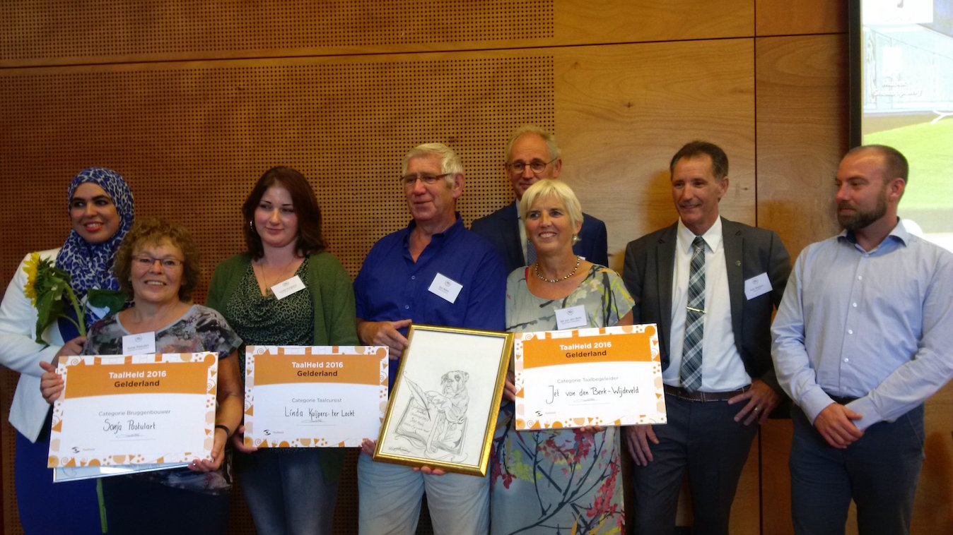Op woensdag 7 september zijn in CODA in Apeldoorn tijdens een feestelijke bijeenkomst de provinciale TaalHelden bekendgemaakt: Linda Kuijpers-ter Locht uit Wijchen (Taalcursist), Jet van den Berk-Wijdeveld uit Nijmegen (Taalbegeleider) en Sonja Postulart uit Beuningen (Bruggenbouwer). TaalHelden zijn mensen die zich bijzonder verdienstelijk inzetten voor een beter geletterd Nederland. Taalambassadeur Jos Niels nam ontroerd de Oeuvreprijs in ontvangst.