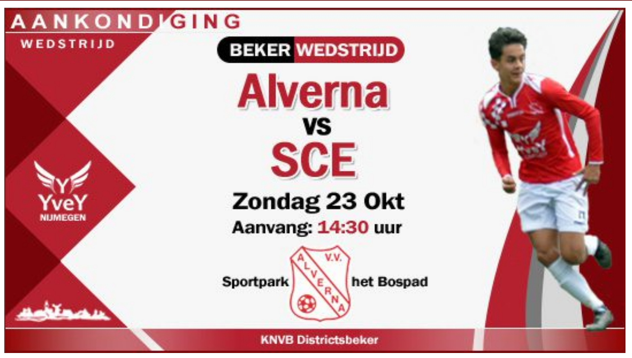 Op zondag 23 oktober won vv Alverna thuis aan het Bospad 5 de bekerwedstrijd tegen SCE uit Nijmegen. Fukuyama besliste de wedstrijd na eerdere doelpunten van Ngola en en v.d. Wal. Check deze website met een update met meer wedstrijdinformatie.