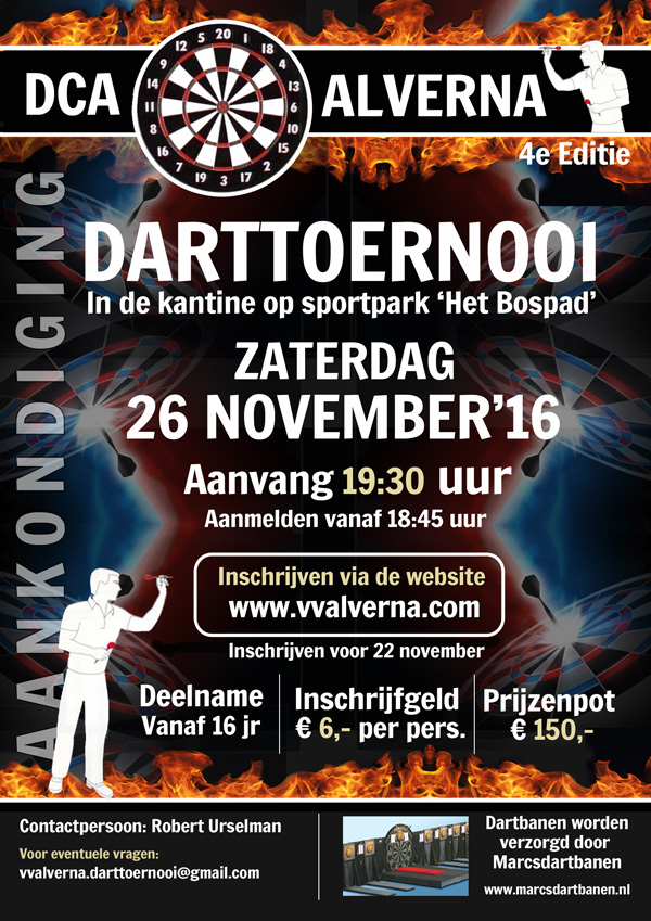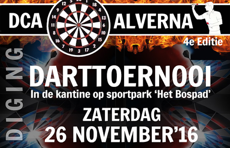 Het DCA Darttoernooi wordt jaarlijks georganiseerd door de activiteitencommissie van vv Alverna. Zo ook dit jaar, waar men al weer toe is aan de 4e editie. Het toernooi vindt plaats op zaterdag 26 november in de kantine van vv Alverna aan het Bospad. Aanvang van de wedstrijden is om 19:30 uur. Het is een open toernooi (vanaf 16 jaar)