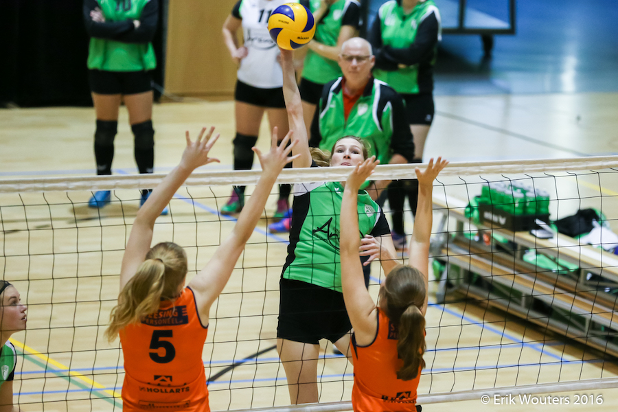 e set. Na de 0-1 voorsprong door Manon Ottjes viel de internetverbinding uit bij de electronische standverwerking bij de wedstrijdleiding. Een zeer lange timeout was het gevolg. Orion scoorde vervolgens 2 maal via de Trivosverdediging. De derde werd uit het veld geslagen 3-2. Lieke Wouters serveerde via de Orion verdediging de bal uit het veld 3-3, waarna de bal met de service rechtstreeks uit werd geslagen 4-3. Nu vond de scheidsrechter dat Trivos de bal aan het ‘liften’ was 5-3. Door Manon Ottjes en Stefanie Beekers werden vervolgens 2 gerichte aanvallen hard ingeslagen 5-5. Nu was het Orion die de bal liftte 5-6. 2 aanvallen van Trivos werden in het net geslagen en de eerste Trivos timeout was een feit. De jonge nummer 8 van Orion plaatste heel secuur een bal in een opengevallen plekje in het Trivos achterveld 8-6. Een misverstand tussen Hennie Visser en Anouk Boereboom liet de bal pardoes op de grond vallen 9-6 en een donkere bui kwam boven het Trivosvlak drijven. Bij 12-7 scoorde Anne Veenstra via het blok 12-8. Bij 17-13 kwam Dionne Schreven in het veld voor Lieke Wouters voor de service. Dit bracht ook geen punt op, omdat Orion met een ongenadig harde aanval het punt binnen haalde 18-13. Bij 19-15 scoorde Anne Veenstra een mooi punt, waardoor er bij Trivos een soort van wederopstanding plaatsvond. Een ware thriller kondigde zich aan. 4 punten op rij werden door Orion gemaakt 23-16, waarna de service werd uit geslagen 23-17.
