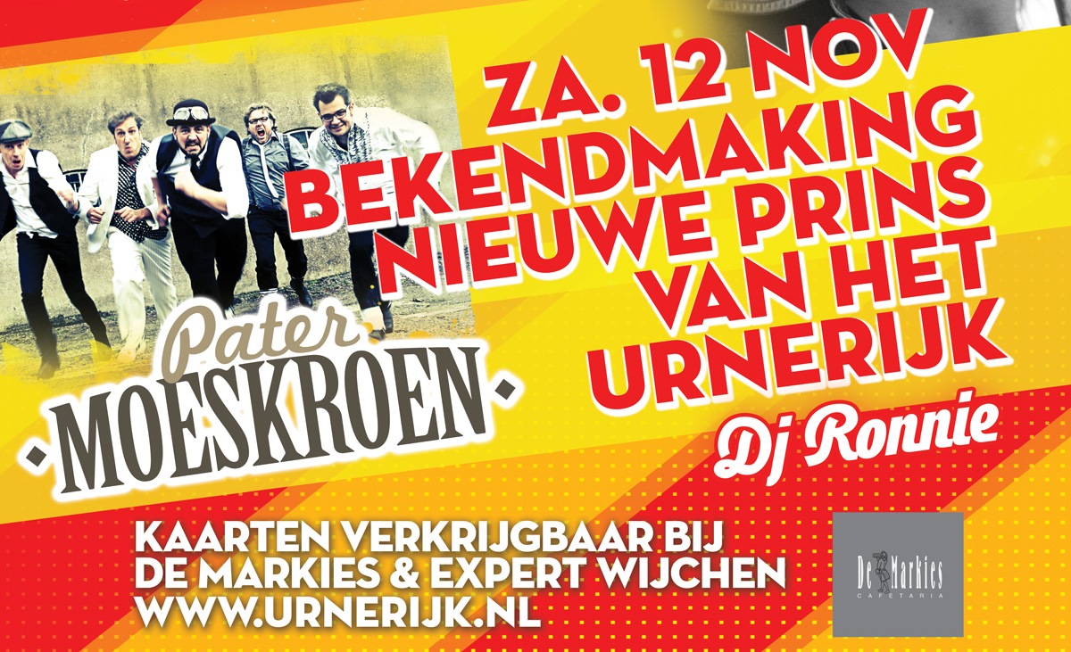- Op Zaterdag 12-11 wordt de nieuwe prins van het Urnerijk bekend gemaakt en zal PATER MOESKROEN een spetterend optreden verzorgen met ondersteuning van onze eigen DJ RONNIE.